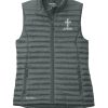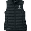 Designed with traditional quilt lines, this insulated vest is built for warmth and weather-resistant performance. Features include full-length interior storm flap with chin guard, exposed, molded zippers with Eddie Bauer logo pulls, zippered hand pockets and a slight drop tail hem. Includes an embroidery access pocket. Packs into zippered left hand pocket. Contrast Eddie Bauer heat transfer logo on right hem. Made of 100% polyester ripstop and 3-ounce, 100% polyester blown fill. PU coating on back of shell. Durable water-repellent (DWR) finish.
